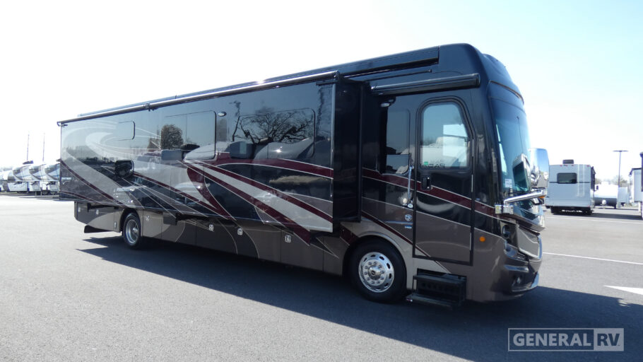 The Discovery LXE 40G delivers a family‑friendly layout wrapped in Fleetwood’s luxury diesel craftsmanship. The mid‑coach bunkhouse gives kids or guests their own dedicated space, while the rear bedroom features a Serenity Series king bed, a full‑length wardrobe, and stackable washer/dryer prep for extended‑stay convenience. A spacious tile shower and well‑appointed bath sit just steps away, creating a true residential feel.