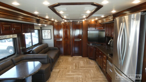 Up front, the living area centers around a 50" LED TV with fireplace, a 72" Apex sofa with mattress, and an oversized Apex U‑bench dinette—perfect for meals, games, or extra sleeping capacity. The galley is equipped for serious cooking with a residential refrigerator, dishwasher, convection microwave, and a galley pull‑out for added prep space.