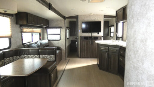 Enter through the door closest to the front and find yourself in the combined kitchen and living area. To the left of the door there is a double kitchen sink, extra counter space for meal prep, a three burner range, and a refrigerator for your perishables. On the opposite side of the trailer there is theater seats and a u-dinette located on a slide. Thanks to the slide there is so much more room to move around. On the interior wall you can enjoy the entertainment center.