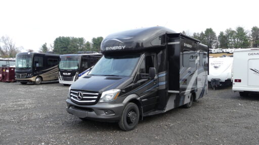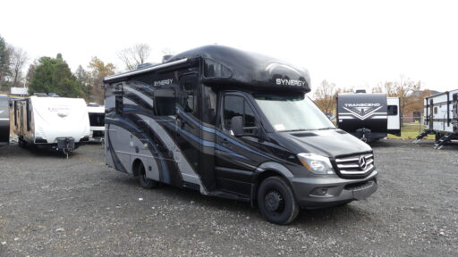 The 2018 Thor Motor Coach Synergy SP24 is a compact yet luxurious RV that combines comfort and style with the reliability of a Mercedes-Benz Sprinter chassis. As you explore this motorhome, you'll find a thoughtfully designed interior that maximizes space and functionality. The center kitchen, equipped with a mid-size refrigerator and a single-burner cooktop, allows for easy meal preparation. Adjacent to the kitchen, the center living area offers a cozy sofa with an air bed, perfect for relaxing or accommodating extra guests. The cab-over bunk provides additional sleeping space, making this RV ideal for families or small groups, comfortably sleeping up to five.