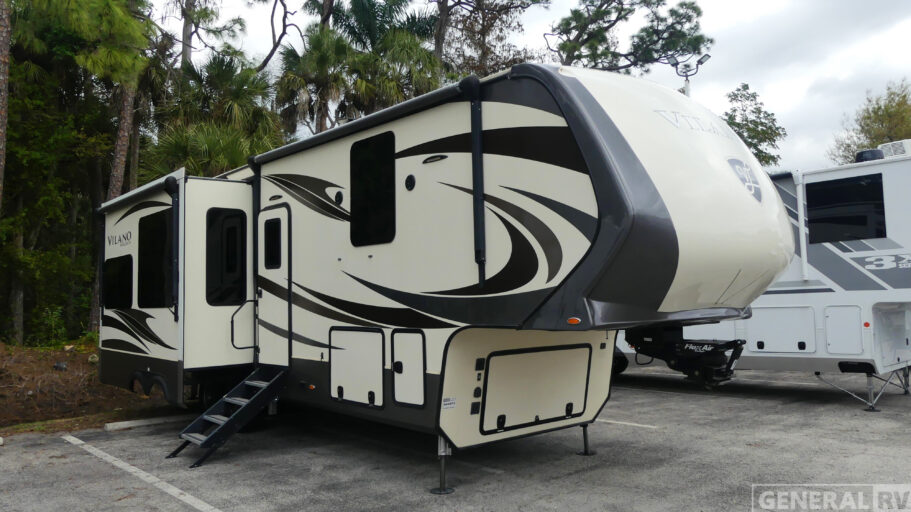 When you choose a Vilano fifth wheel, you get a luxurious and classy unit without the high-end price tag. On the exterior portion of the Vilano, you will find a fully enclosed and heated underbelly with heat return and a Noble T60 high-gloss fiberglass exterior, and on the interior you will enjoy solid surface kitchen countertops and LED recessed lighting. With a Vilano you always receive the latest in entertainment technology, such as the surround sound system in the living room, the entertainment center with Bluetooth capabilities, the USB ports in the bedroom nightstands, and the multiplex wiring system with a digital home screen. Whatever your future adventuring plans may be, the Vilano fifth wheel will be there to enhance every aspect of your trip.