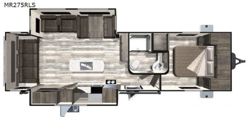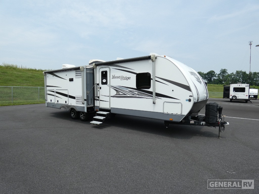 The thoughtful layout includes a front bedroom with a cozy queen bed, offering a restful retreat after a day of exploration. With two slides, this RV provides generous living space, and the powered retractable awning extends your outdoor enjoyment, offering shade and shelter. The center bath is conveniently placed for easy access, featuring a practical shower with a plastic and glass enclosure. With a 51-gallon fresh water capacity and a robust heating system, comfort is always at your fingertips. Discover the freedom of the open road with the Mesa Ridge Limited 275RLS, and let your adventures begin. For more information, visit your nearest General RV dealership.