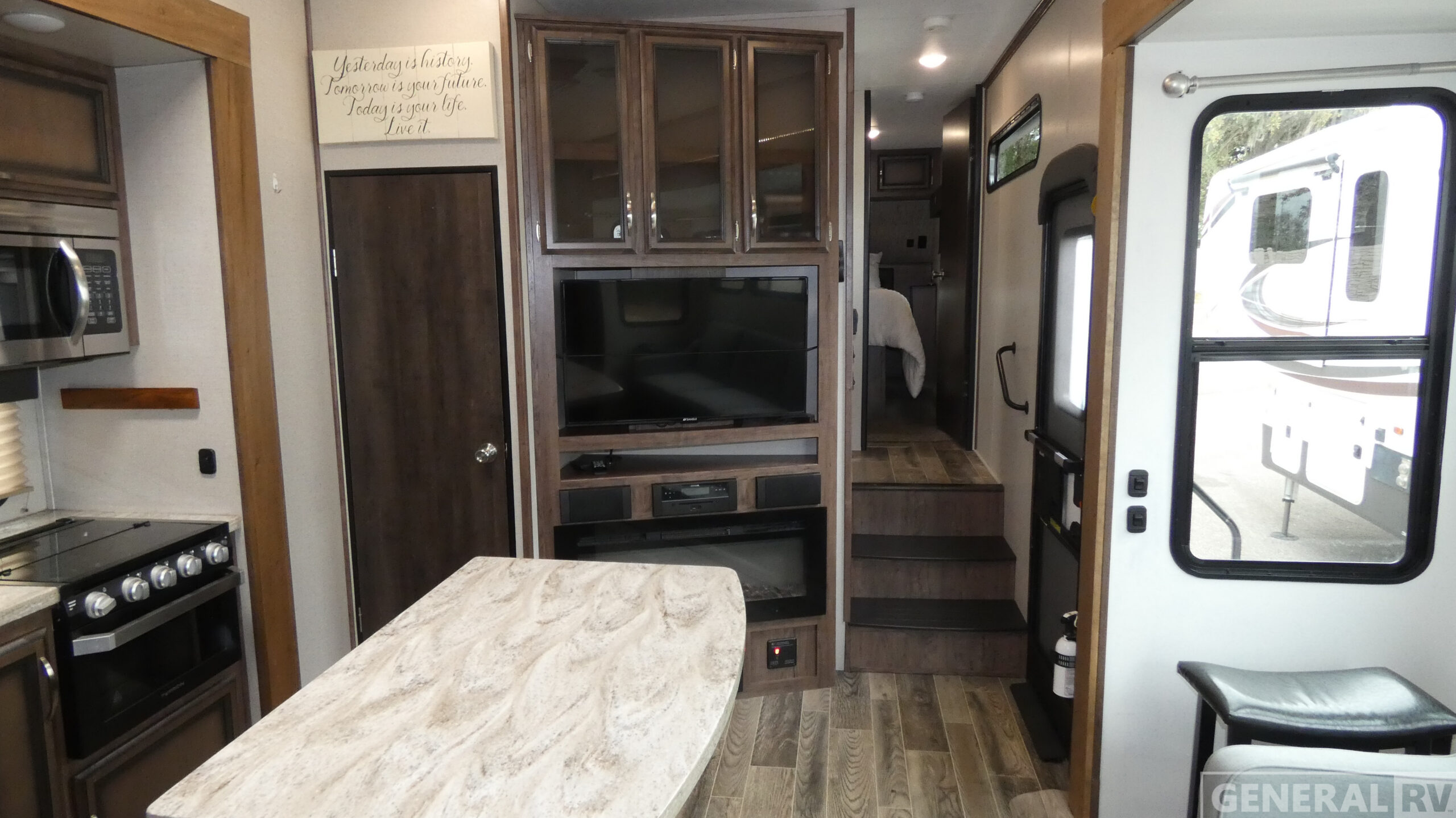 I'ts time to load up your off-road toys in 13' of separate garage space, and your clothing in the front bedroom wardrobes, and your non-perishables in the walk-in pantry. You will find even more storage including in the exterior pass-through compartment for those larger items when headed out for the weekend or a longer trip. You might choose to add the washer/dryer option in the garage to keep everything clean the whole time. The main area includes a super sofa slide, a kitchen island with stools, a fireplace and TV, plus plenty of appliances to keep the gang fed. The master bedroom offers privacy and a king bed. There is more!