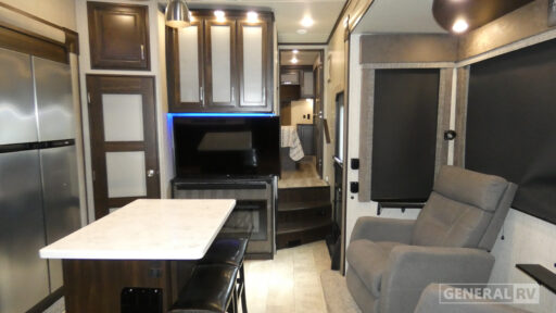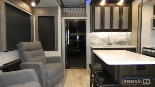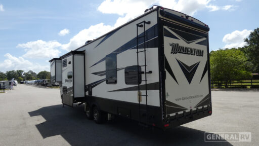 This model comfortably sleeps up to nine, featuring a queen bed, optional king bed, and convertible sleeping areas, making it ideal for families or group adventures. The front bedroom offers a serene retreat, complete with overhead cabinets for all your essentials. The washer-dryer prep ensures you can keep your gear fresh, even on extended trips. With three slides, dual awnings, and an impressive 157-gallon fresh water capacity, the Momentum 349M is designed for extended stays in the great outdoors. Visit your nearest General RV dealership to explore this remarkable RV and start planning your next adventure.