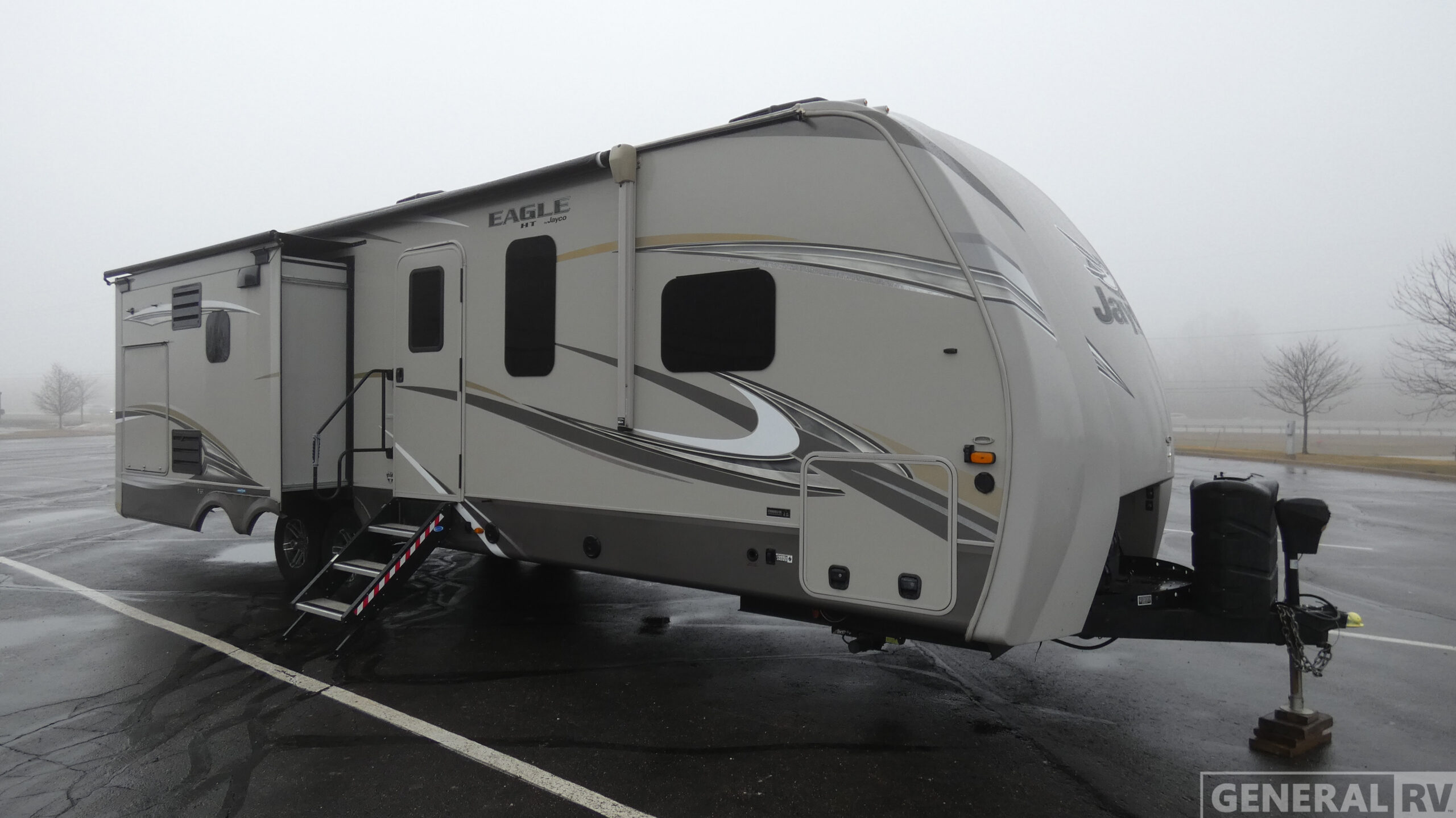 With each Jayco Eagle HT travel trailer, you can travel with your half-ton truck! The interior offers features such as a residential Serta mattress with under-bed storage, a CPAP-prepped bedroom, large windows, solid hardwood slide fascia, residential flooring made in the U.S.A., and dual USB charging ports in the kitchen and bedroom. The StrongholdVBL aluminum-framed and vacuum-bond laminated gel-coated fiberglass exterior walls including the rear wall and slide room end walls, the fully enclosed and heated underbelly, the industry-exclusive HELIX cooling system, the JaySMART safety markers and reverse travel, and the 4-Star Handling package just makes traveling safer and easier! Choose the model that suits your family's needs and wants, and start camping the right way today!