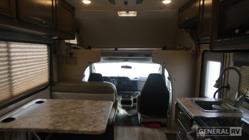 With any Four Winds Class C gas motorhome, you will enjoy the ease of driving and the affordable price. On the interior you will find residential vinyl flooring, high-sheen cabinetry with nickel finish hardware, and laminate countertops which make it easy to clean after a weekend getaway or an extended vacation. The stainless steel bathroom sink and foot flush porcelain toilet provide added convenience every where you stop, and the skylight above the shower is an exceptional feature that brings in the morning sunlight and brightens up the interior.