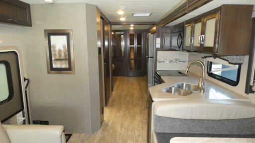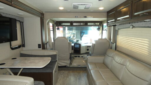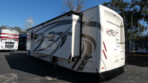 With any Thor Motor Coach Hurricane Class A gas motorhome you will begin with a welded tubular steel frame with a welded tubular aluminum roof and sidewall cage construction. Some exterior features include the one-piece fiberglass front and rear caps, the automatic leveling jacks with Touchpad controls, and the Pet-Link multi-purpose tie-down allowing you to keep your family pet safely near you. More features you are sure to enjoy while on your adventures, the touch screen radio with Bluetooth connectivity, SiriusXM radio, and monitor for your rearview and side view camera, the flip-out workstation, the easy to care for residential vinyl flooring, the Leatherette furniture, the USB charging ports and so much! Start your Hurricane adventure today!