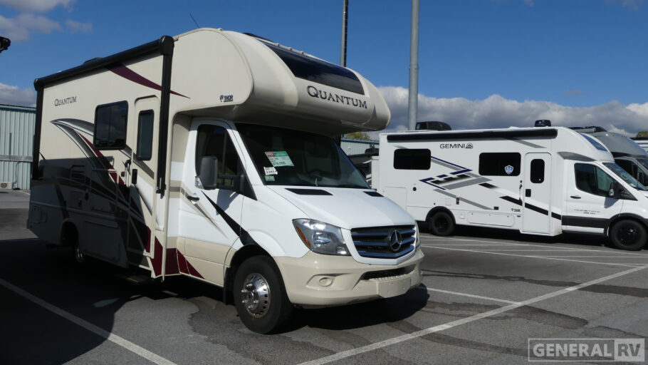 Built on a Mercedes-Benz chassis, the Quantum Sprinter Class C diesel motorhome by Thor Motor Coach was built with your comfort in mind. Each model includes lighted rotocast storage compartments for all your gear, a power patio awning with integrated LED lights to create an outdoor living space, and a fiberglass front cap with a skylight and power shade. Inside, you'll enjoy residential vinyl flooring, an 84" ceiling height for more standing space, a double-door refrigerator, a convection microwave, and many more features. You'll love the Platinum Package which comes standard and includes a touchscreen dash radio with navigation and back-up monitor, stainless steel wheel liners, solid surface countertops, premium window privacy roller shades, and an outside shower!