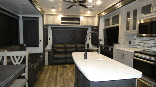Patent-Pending Windshield Rear Living Area Fireplace Kitchen Island Theater Seating Free Standing Dinette