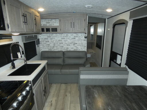 You are sure to love this Keystone Springdale travel trailer from the front private bedroom to the many different storage spaces for all of your camping needs! This trailer is fabulous for your larger family or group of friends because it has a set of double-size bunks which will provide compact yet accommodating sleeping arrangements for your kids or friends. There is also a convenient full bathroom located next to the bunks which should help eliminate any late-night accidents. You can enjoy your delicious meals at the booth dinette or even the sofa, and both of these can transform into extra sleeping spaces whenever needed.