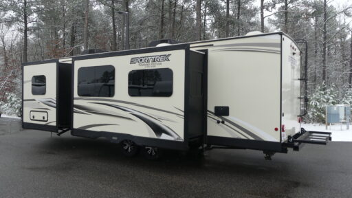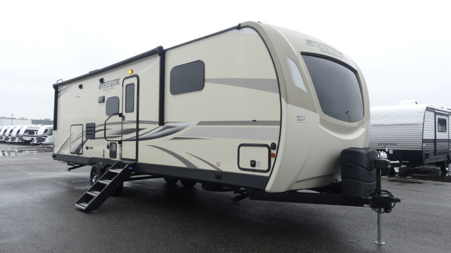 Every one of these SportTrek Touring Edition travel trailers by Venture RV have been built with a new sleek exterior that includes a painted fiberglass front cap with an integrated LED lighting! The Weather-Shield package includes insulation components that will allow you to camp in any season like the enclosed gate valves, the 360 degree radiant foil insulation, the radiant foil-wrapped tanks, and the reflective PVC roof membrane. Their solid construction offers peace of mind, as well as the comforts of home with the modern farmhouse design and the Venture connectivity board with Bluetooth control. There is a wide range of models for you to choose from, so come find the perfect one for you today!