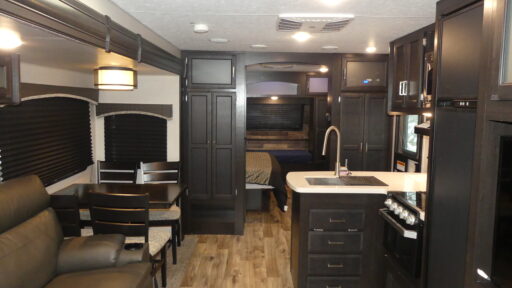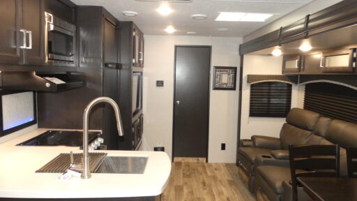 Head out on your greatest camping adventure with this travel trailer! The full rear bathroom has a 34" radius shower to freshen up in each morning, a linen closet to store your towels, and even a closet that has a dresser with a mirror and is prepped to add the optional washer and dryer. The 70" sofa is directly across from the entertainment center with a fireplace to enjoy a cozy evening. There is also a fireplace in the front private bedroom, as well as a king bed slide, a front window seat with wardrobes and shelves on either side, and sliding doors. The chef will enjoy cooking dinner indoors with the three burner cooktop, but love cooking at the outside campfire cafe even more!