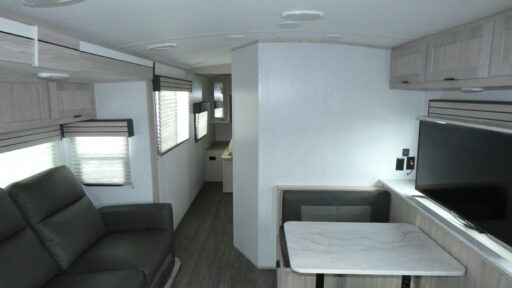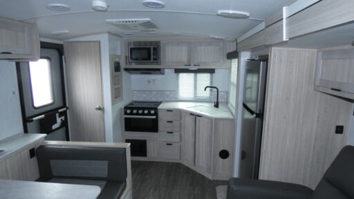 With dual entry doors, you will experience a smooth flow of traffic in and out of this travel trailer! One of the entrances even leads directly into the front private bedroom which has a patent pending king bed sliding system with a pet palace underneath, wardrobes on either side of it, and a wardrobe above a dresser to keep your clothes out of the way. The full bathroom has a full shower for you to freshen up in each morning and you can fry some bacon up on the three burner cooktop then enjoy it at the booth dinette. There is also a walk-in pantry big enough to store your favorite snacks and canned goods!