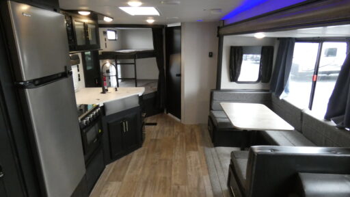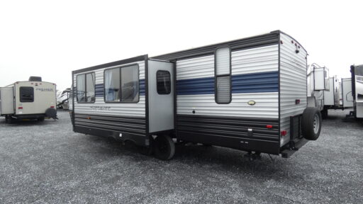 With dual entry doors, you will experience a smooth flow of traffic in and out of this travel trailer! Everyone will have a comfortable place to sleep between the walk around queen bed, the set of double bunk beds with a ladder, and even the U-shaped dinette and sofa slide transform into extra sleeping spaces. The front private bedroom also has wardrobes on either side of the bed, a closet, a TV mount area, and an exit/entrance door to sneak out for an early morning fishing trip. Rinse off in the rear corner bathroom with the tub/shower after fishing and then fry your catch of the day on the two burner cooktop at the outside kitchen. The outside also has storage areas, a TV mount, and a rear storage rack!