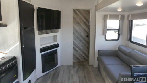 This fifth wheel is going to make an impression on anyone that steps foot inside or walks around the outside! From having a second entry/exit door into the rear bunkhouse and a main entry into the living and kitchen area, plus having an outside kitchen to make meals in the great outdoors, nobody will ever want to go home! The rear bunkhouse also includes a Versa queen bed plus two flip-down upper bunks, plus storage. The front bedroom gives you privacy from everyone and there is a walk-around queen bed, three wardrobes and a space prepped for a washer/dryer. The full bathroom will keep everyone refreshed, and the inside kitchen has full amenities including an L-shaped counter. There is hidden storage behind the 40" LED TV with fireplace below.