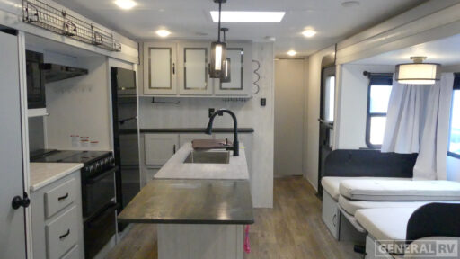 This travel trailer allows you to enjoy the Great Outdoors without having to give up your creature comforts. The dual opposing slides provide the chef space to work around the kitchen island, and there is plenty of seating space for your guests on the dual recliners, the sleeper sofa, and the booth dinette. The fireplace and LCD TV will be perfect for those rainy days, and there is even a living area skylight to let natural light in. This model also includes Sure-Step entry steps, a large pass-through storage, plus two power awnings with LED lights so you can spend more time outdoors with friends and family!