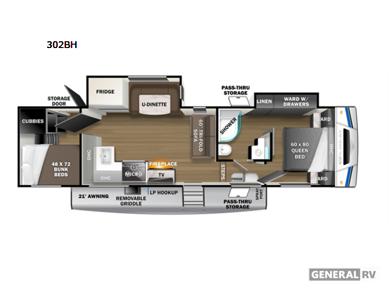 The Wildcat 302BH features a center living area with a tri-fold sofa and U-dinette, providing ample space for relaxation and entertainment. The cozy fireplace and entertainment center make it a perfect spot to unwind after a day of exploration. The bunkhouse offers additional sleeping space, while the front and rear bedrooms provide privacy and comfort. With its powered retractable 21 ft. awning and outdoor griddle, you can enjoy the great outdoors with ease. Plus, with generous storage options, including pass-thru storage, you'll have plenty of room for all your gear. To explore this model further, visit your nearest General RV Dealership Location.