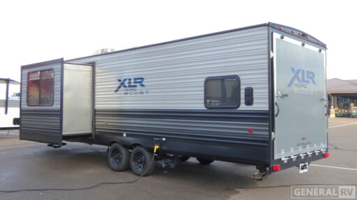 Each XLR Micro Boost toy hauler is made to last through years of use thanks to the seamless PVC roof system, the diamond plate front rock guard, and the Body Armor enclosed and insulated underbelly. You will appreciate the oil and gas resistant residential linoleum and the moisture barrier floor enclosure to keep your space clean, and the lightweight design will be perfect for smaller tow vehicles. Each model includes residential stainless steel sinks, decorative kitchen backsplash, solid core cabinet stiles, and large panoramic windows for breathtaking outdoor views. The exterior includes many convenient features to make camping easier than ever, including a pet leash for your furry friends, insulated storage doors, a hot and cold exterior shower, plus a friction hinge entry door. There is even a power awning with blue LED lights and two exterior speakers for the ultimate outdoor living space.