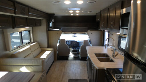 There is plenty of sleeping and seating space for everyone in this motorhome between the bunk over cab, the queen bed in the rear private bedroom, the sofa, and booth dinette which transform into sleeping spaces! The separated bathroom makes it convenient for one person to freshen up in the shower while another uses the private toilet and stainless steel sink with a dual control faucet. The private bedroom also has a wardrobe slide for your clothes and ledges on either side of the queen bed to set your electronics or cup of water!