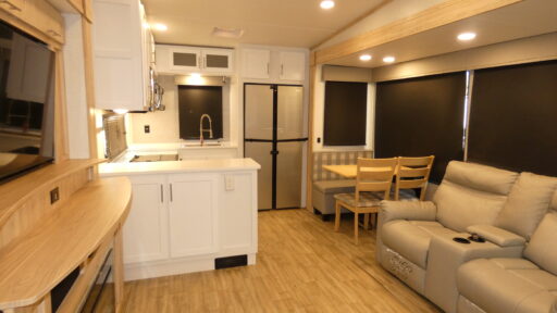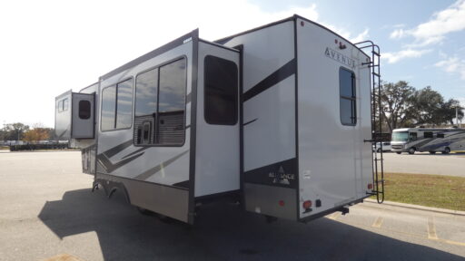 A benchmark chassis creates a space saver upper deck with each one of these Avenue fifth wheels by Alliance RV! The 101 in. wide-body construction gives you more room to walk around and the flush slide out floors throughout prevent any tripping. There are Azdel composite sidewalls inside and out, and a seamless fully walkable PVC roof for extreme durability, zero maintenance, and it is more solar reflective because of the bright white color. Twin 13,500 BTU A/C units provide 27,000 BTUs of cooling power which are ultra quiet and independently controlled keeping you comfortable during your entire trip. And, the fully enclosed and heated underbelly means that you can extend your camping season into the colder months if you like. You are sure to love the "no carpet zone" making each Avenue easy to clean and allergen free, not to mention pet friendly with vinyl flooring throughout. And, strategically placed Atrium windows in the bedroom and living area will not only provide more light, cross ventilation and fresh air, but bring a spectacular view of your surroundings right inside. You can maximize your space throughout with innovative storage solutions like the hidden storage behind the TV, inside the end tables, ottoman, and dinette chairs. Come choose your favorite model today!