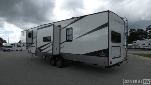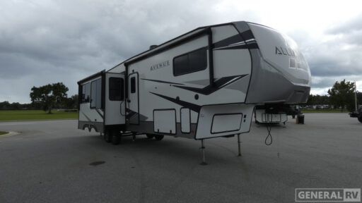 A benchmark chassis creates a space saver upper deck with each one of these Avenue fifth wheels by Alliance RV! The 101 in. wide-body construction gives you more room to walk around and the flush slide out floors throughout prevent any tripping. There are Azdel composite sidewalls inside and out, and a seamless fully walkable PVC roof for extreme durability, zero maintenance, and it is more solar reflective because of the bright white color. Twin 13,500 BTU A/C units provide 27,000 BTUs of cooling power which are ultra quiet and independently controlled keeping you comfortable during your entire trip. And, the fully enclosed and heated underbelly means that you can extend your camping season into the colder months if you like. You are sure to love the "no carpet zone" making each Avenue easy to clean and allergen free, not to mention pet friendly with vinyl flooring throughout. And, strategically placed Atrium windows in the bedroom and living area will not only provide more light, cross ventilation and fresh air, but bring a spectacular view of your surroundings right inside. You can maximize your space throughout with innovative storage solutions like the hidden storage behind the TV, inside the end tables, ottoman, and dinette chairs. Come choose your favorite model today!