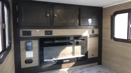 Pack your bags and head for the hills in this easy-to-tow trailer for two! The full outside kitchen includes everything you need to prepare meals each day, and there is an outside shower to fill the dogs water bowl or wash off your hiking boots. Head inside to rest on the 60" x 78" mattress, or maybe just relax by the fireplace and listen to your favorite tunes with the stereo included! This model also includes a countertop with storage below, an A/C and furnace to camp all year long, and a vent to keep fresh air moving inside!