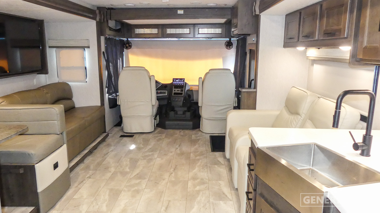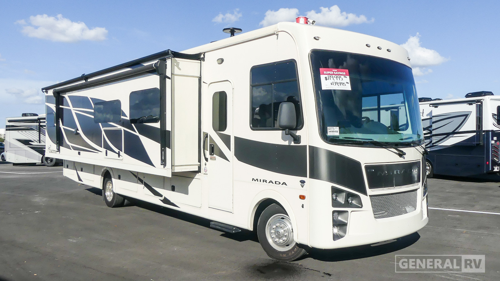 As you move towards the rear, the Mirada 35OS continues to impress with its private master bedroom, featuring a luxurious 70" x 74" king bed and ample storage. The center bath, complete with a plastic/glass shower, offers convenience and privacy. With washer/dryer, this RV is ready for extended journeys. The 20 ft. powered retractable awning extends your living space to the outdoors, providing shade and comfort for those sunny days. Built on a robust Ford F53 chassis with a 350 horsepower engine, this motorhome combines power with elegance, ensuring a smooth ride wherever your travels may take you. For more details or to see it in person, visit your nearest General RV dealership.