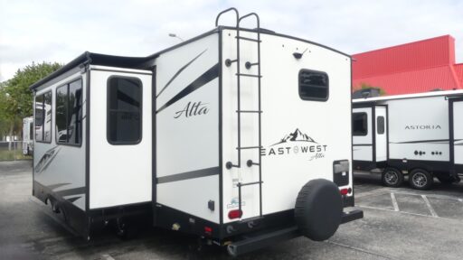 Each Alta travel trailer by EAST TO WEST is constructed with a 5" vacuum bonded roof, flush floor slide outs (where applicable), and diamond plate front rock guard for added protection. Outside, you'll find marine-grade exterior speakers, a universal docking station, and back-up camera prep that can be added to make maneuvering in and out of campgrounds easier than ever. There are USB charging stations for your tablet or phone and designer solid surface countertops you are sure to love. The furnace and 15,000 BTU ducted A/C with quick cool will keep you comfortable in any season, and the 81" interior ceiling height will provide ample space to move about without feeling confined. Start a new adventure in an Alta travel trailer today!