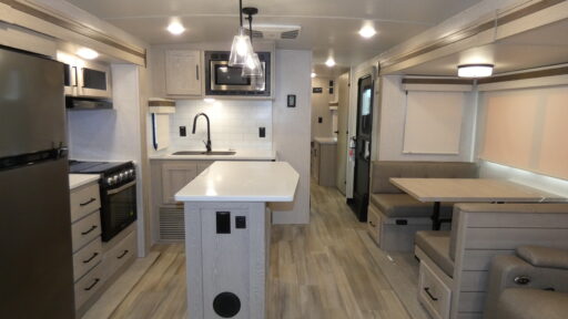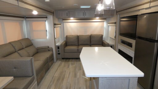 This trailer allows you to seat nine people, and the kitchen island provides a great place to place for the snacks and beverages. The dual opposing slides give the main living and kitchen area lots of floor space for everyone to move around, and the double entry bath is convenient with access from the hallway and the master suite. The front bedroom offers a queen bed slide, a wardrobe and storage along the front wall. And the two 11' power awnings give you an outdoor living area protected from the elements, just add your camping chairs.