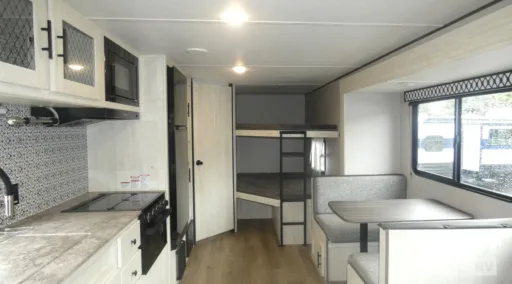 This trailer allows you to camp in comfort with conveniences such as dual exterior entry doors allowing you access to the main area or the rear corner bathroom. The bathroom also has an interior entry that is next to the double-size bunks which is super convenient at night for the kiddos. You will also find floor storage under the bunks. The large slide out offers extra floor space inside to move about, and includes the booth dinette and sofa for inside relaxation and dining. The galley kitchen provides full amenities including a pantry and a 10 cu. ft. refrigerator for lots of food storage. And you can sleep like a queen in the front dual entry bedroom that offers plenty of clothing storage and an overhead shelf for more items.