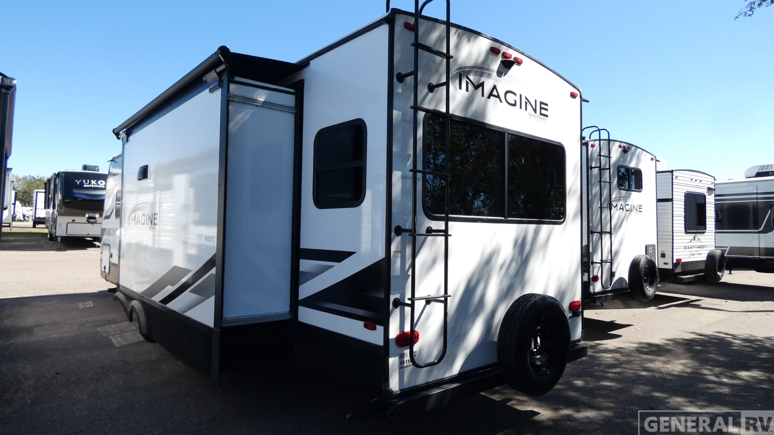 Just imagine leaving the world behind and secluding yourself away with your favorite people in your Grand Design Imagine travel trailer! The Imagine has been designed to enjoy extended season camping and includes a high-capacity furnace, a heated and enclosed underbelly with suspended tanks, a designated heat duct to the subfloor, and a high-density roof insulation with attic vent. You'll have maximum head room on the interior with 81" radius ceilings, and large panoramic windows to let in natural lighting. The exclusive drop-frame pass-through storage compartment is going to allow you to bring along lots of equipment, and the universal docking station is an all-in-one location for utilities and hook-ups. You'll also have industry-leading tank capacities so that you can fill and empty your tanks less often.