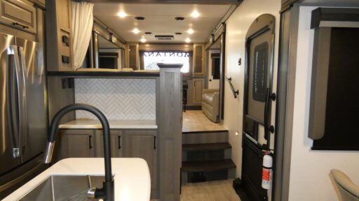 Life will be easier at the campground in this fifth wheel with a bath and a half! The full rear bathroom has a 48" x 30" fiberglass shower with a seat and skylight above, a linen closet to keep your towels close, a dual sink vanity for two to get ready at once, and a barn door to close off the master suite. The bedroom also has a king bed slide with storage underneath across from a dresser with a 32" Smart TV and wardrobe, as well as a large closet that is prepped to add a washer and dryer. The chef can prepare their best meals with the kitchen island, the glass top range with convection microwave and range hood with a pull-down spice rack, plus there is a pantry/buffet and a free standing legless dinette to enjoy your meals at. The front living area will have you feeling right at home with the front entertainment center that has a telescoping 50" Smart TV, a 5,000 BTU decorative fireplace heater, and storage on either side. There is also opposing hide-a-bed sofa slides for extra sleeping spaces and power Thomas Payne theater seating for even more comfort!