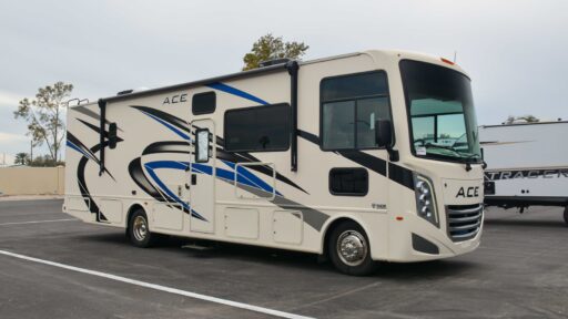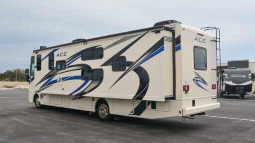 The A.C.E. 32B's center kitchen is equipped with a mid-size refrigerator and a three-burner cooktop, making meal preparation a breeze. Whether you're enjoying a quick breakfast or a family dinner, the kitchen's functionality will impress. The powered retractable awning extends your living space outdoors, perfect for enjoying the scenery or hosting a barbecue. With a Ford F53 chassis and a robust Triton V8 engine, this motorhome promises a smooth drive, while the 8,000-pound towing capacity allows you to bring along all your favorite toys. Experience the perfect balance of style, comfort, and adventure with the A.C.E. 32B. For more information, visit your nearest General RV dealership.