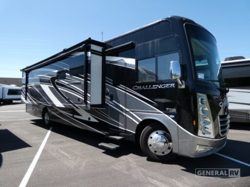 The Challenger 37FH comfortably accommodates up to eight guests, with a king-size Tilt-A-View bed in the master suite, a full-size bed, and convertible sleeping options in the dinette and sofa. The rear and center bath areas provide convenience and privacy, with ample storage space to keep everything organized. Outside, the 20-foot powered retractable awning creates an inviting outdoor space, perfect for enjoying the fresh air and scenic views. With a towing capacity of 8,000 pounds, you can bring along extra gear or a vehicle for even more adventure. For more details and to see this stunning RV in person, visit your nearest General RV dealership.