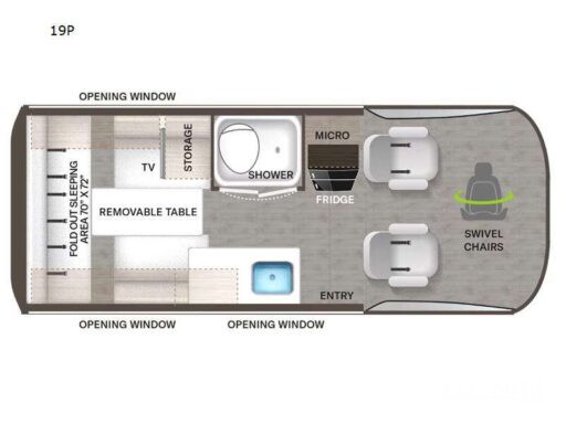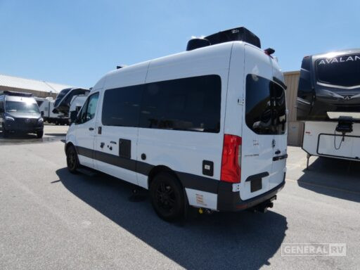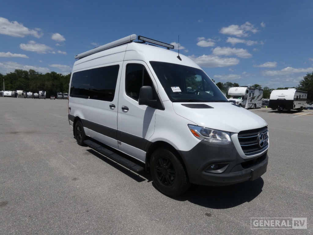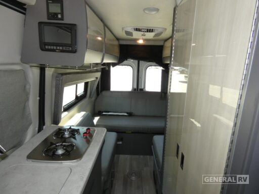 Inside, the Sanctuary 19P is thoughtfully designed to maximize space and functionality. The center kitchen is equipped with a two-burner cooktop and a compact propane refrigerator, perfect for crafting delicious meals on the go. The fold-out electric sleeping area transforms into a cozy 70" x 72" bed, ensuring restful nights under the stars. A cleverly designed center bath features a shower with a curtain, offering convenience without compromising on comfort. The swivel chairs add flexibility to the living space, allowing you to relax and enjoy the journey. With its combination of style, efficiency, and Mercedes-Benz luxury, the Sanctuary 19P is your perfect companion for any adventure. For more details, visit your nearest General RV dealership.