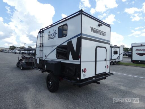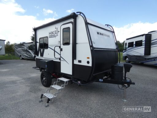 The Hike 100 travel trailers by Winnebago Industries Towables are the outdoor enthusiasts dream RV! It's light enough to be towed by smaller tow vehicles, but still includes plenty of space for your gear. Each model is constructed with one-piece thermo-foil insulation, an NXG engineered frame, a fully enclosed underbelly and tanks, plus a fully walkable roof. You will love the 200-watt solar panel with side-mount solar prep for your off-grid needs, and the patented powder coated exterior exoskeleton rack will be perfect for kayaks, hiking gear, or paddleboards. There are also thick core pass-through storage doors outside, along with a power awning with LED lights, plus power stabilizer jacks and a power tongue jack to be set up in no-time! The interior features contemporary cabinetry, USB ports to charge your electronics, additional gear storage, plus a portable JBL speaker to listen to your favorite tunes at the campsite.