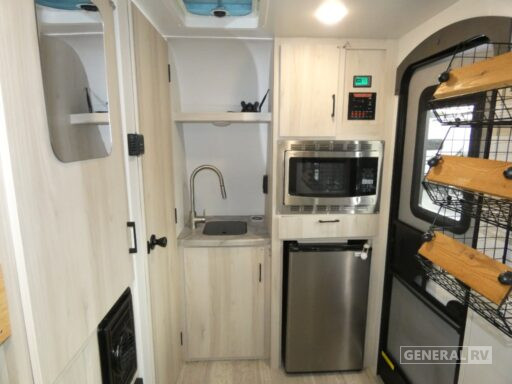 If you love to explore the great outdoors during the day and enjoy creature comforts at night, this trailer is for you! The 29 1/2" x 41" rear bike door allows you to quickly stow your bikes or other camping items inside that you want to protect. The front kitchen amenities include a portable induction cooktop, an undermount single bowl sink with a cover, a convectionmicrowave, and a 3.1 AC/DC compressor refrigerator. You can eat while sitting on the folding bench seats with a folding table before falling asleep on the twin bunk beds. And there is a wardrobe for your clothes, and a wet bath for convenience.
