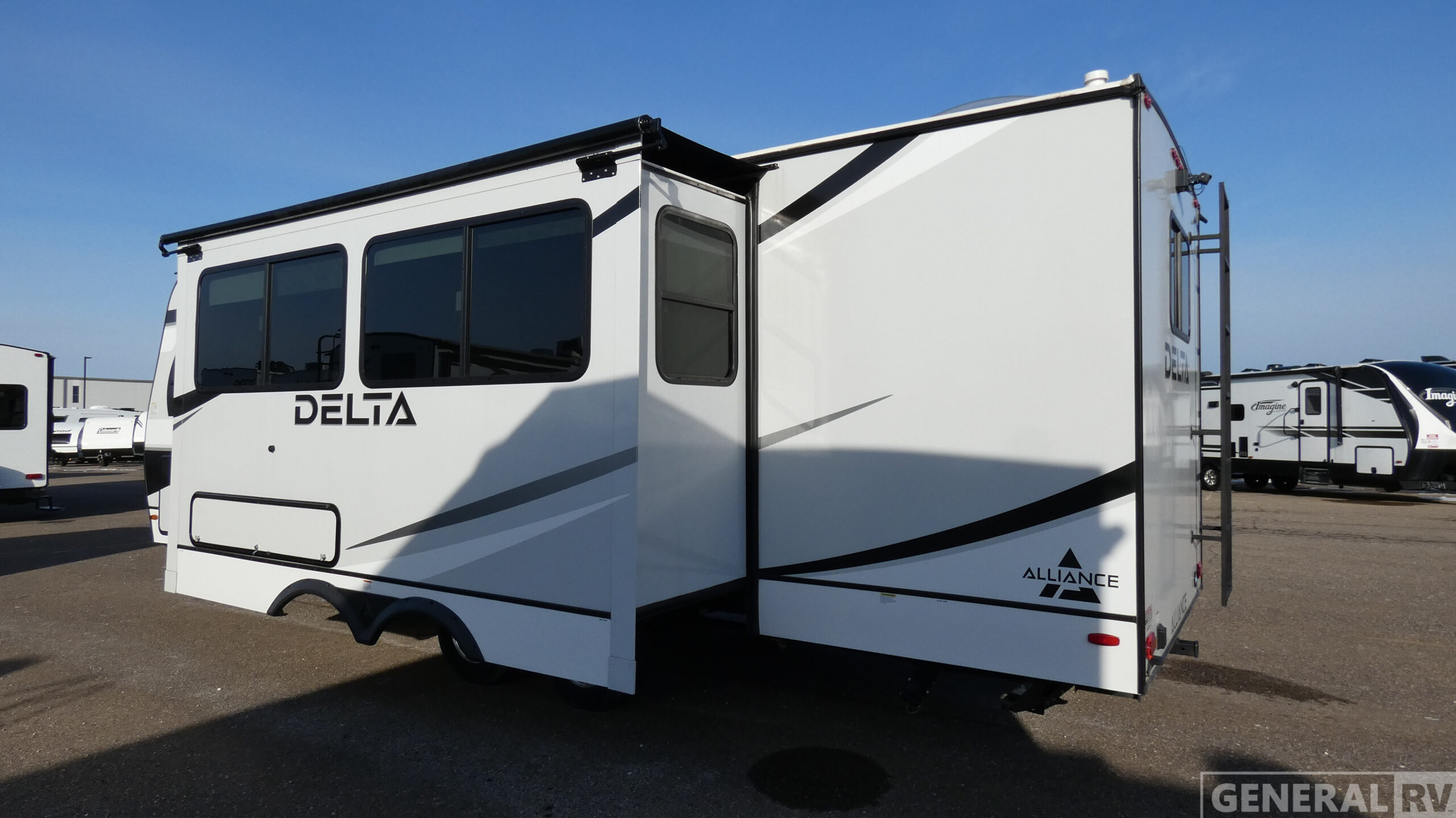 Form and function works together with every one of these Alliance RV Delta travel trailers! They are built with a walk-on roof with a seamless PVC roof covering, Mylar reinforced exterior seals, and a heated and enclosed underbelly to protect your unit in all seasons. The commercial grade vinyl flooring will be easy to clean and the oversized atrium windows throughout let in plenty of natural sunlight. With 62 cu. ft. of drop frame pass-through storage, you can bring along all of your essential camping gear plus it has USB charging for more convenience. There are many at home interior conveniences including a Bluetooth speaker, USB charging throughout, and even a pull-out kitchen trash can. Come find your favorite model today!