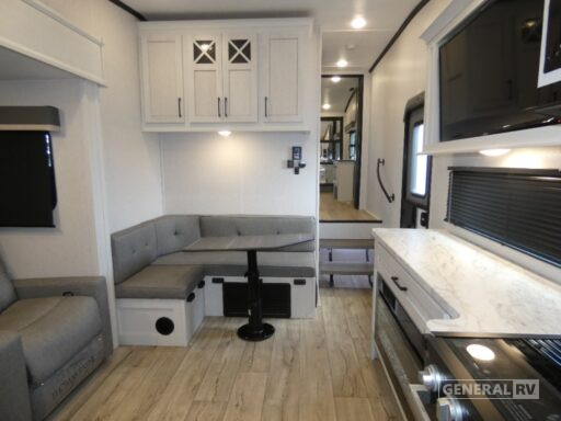 Plan to say awhile in this rear kitchen fifth wheel! You will fall in love with the front bedroom with a king bed slide out, large front closet, a dresser, plus a mounted TV for movies in bed. The rear kitchen includes plenty of space to prep meals, a farm style sink, plus a 10 cu. ft. 12V refrigerator and a pantry for food storage! You can get cozy on the theater seating slide out or at the cafe dinette, and the LED TV will ensure you'll never go bored on rainy days!