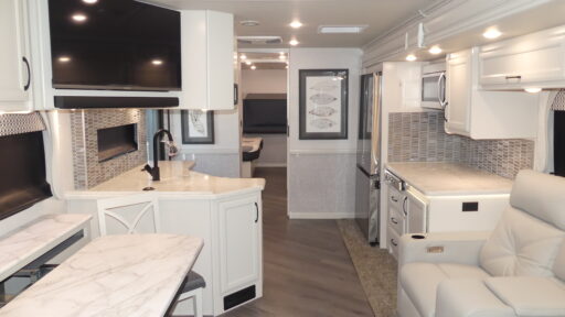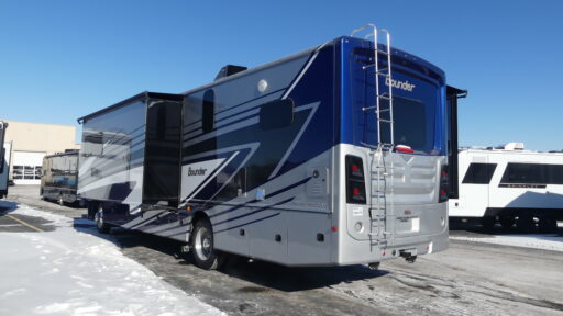 Looking for a spacious RV with a mid-coach entry, four distinct areas, and offers a way to work while on the road plus be able to host a dinner party for friends and family? This Bounder gives you all that and so much more like a stainless steel farmhouse sink, a solid surface top in the galley, and full extension drawer guides with latches, plus full amenities to make any meals including a convection microwave and residential refrigerator. The split bathroom is super convenient when trying to get ready in the mornings. One person can be washing their hands in the private sink and toilet room while another person can be using the second sink beside the neo-angled shower. Yet you can also close two sliding doors to make this one big bathroom for yourself. And the multi-purpose Adapt-table dinette allows you to work or eat breakfast for two, and you can easily swing the table out vertically to host four. The rear bedroom offers a slide out king bed, plus plenty of storage and an LED TV to watch before falling asleep.