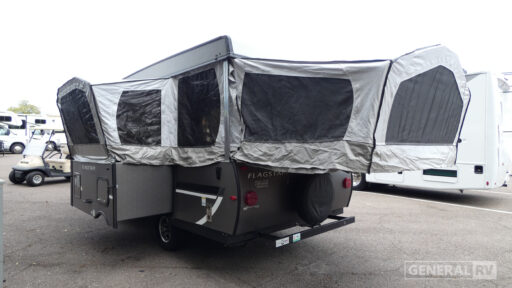 Retire the family tent for one of these Forest River Flagstaff MAC Series folding pop-up campers! Each trip will be one to remember because it will be so easy to load up and head out, yet you will still have what you need to enjoy your time away. The Flagstaff MAC Series includes Vinolon Supreme tenting material, storage nets over the bunks for your belongings, and heated mattress bunk ends for maximum comfort. Each model has a power roof lift and four stabilizer jacks with sand pads for easy set-up, a one-piece screen door to keep the bugs out, and a sleek gray exterior. There are many more features that make the MAC Series campers the perfect camping trailer, like the exterior awning with LED lighting, 20,000 BTU furnace for cool nights, included water filter, plus more!