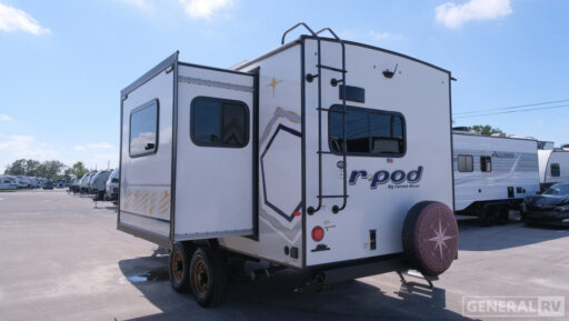 With any R Pod travel trailer by Forest River, you will find affordable luxury and lightweight towing! The Azdel sidewall construction and aluminum framing provide a durable RV made to last, and you'll love the new premium exterior graphics! There is also a tire pressure monitoring system outside, along with a friction hinge entrance door, a power tongue jack, and an exclusive aluminum wheel upgrade. Head inside to enjoy butcher block countertops, multipurpose vinyl furniture, a Showermiser water system, and new Cosmic Graphite decor. The large solar panel will provide off-gird capabilities, plus there is a 2,000W inverter and 30A charge controller for added convenience!