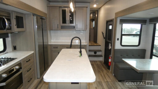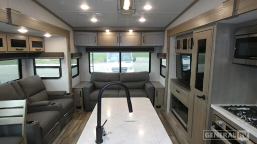 Venture towards the front, and you'll find a sanctuary in the bedroom with a queen bed, or opt for a king if you desire more space. The center bath provides a touch of elegance with its fiberglass shower, ensuring you start each day refreshed. With ample storage throughout, including an unobstructed pass-through compartment, your gear will always be organized and accessible. The dual awnings extend your living space outdoors, perfect for enjoying the scenery. Discover this exceptional RV at your nearest General RV dealership and elevate your travel experience.