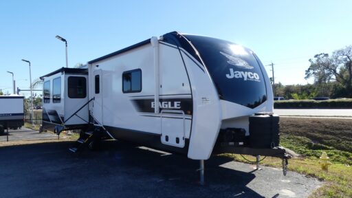 With any Eagle fifth wheel or travel trailer by Jayco you will appreciate durable construction materials, like the Magnum Truss Roof and the Stronghold VBL laminated walls. The JAYCOMMAND Smart RV system puts you in control of your RV's functions, and the 5 Star Handling Package will provide smooth towing from home to camp. Each model features Climate Shield zero-degree tested weather protection and the industry-exclusive HELIX cooling system that will keep you comfortable year around. Some of the exterior conveniences you are sure to love are the pass-through storage with Slam-Latch baggage doors and an automotive style front cap with max turn radius. The Eagle fifth wheels and travel trailers are designed to make you feel at home with solid hardwood slide fascia, residential vinyl flooring, a bathroom skylight, and plenty of storage for all your belongings.
