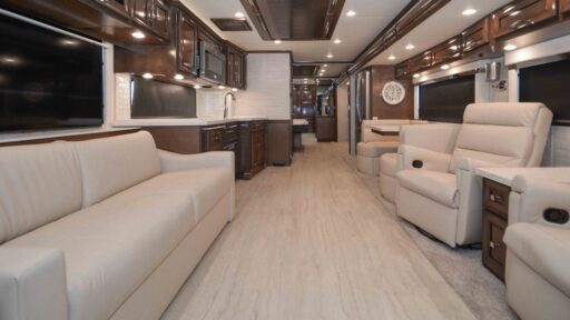 Discover the epitome of luxury and innovation with the 2024 Newmar Ventana 4369. Designed for those who crave adventure without sacrificing comfort, this magnificent diesel pusher offers a harmonious blend of style and functionality. With a spacious floor plan that sleeps up to nine, you'll find a king-sized bed in the master suite and convertible sleeping areas that ensure everyone has a cozy place to rest. The center kitchen is a chef's dream, equipped with a full-size electric refrigerator and convection cooking, perfect for preparing gourmet meals on the road.