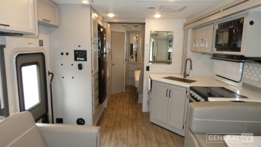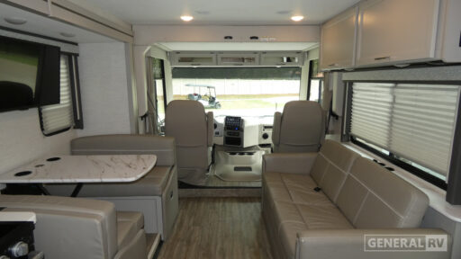 The A.C.E. 29G's floorplan is thoughtfully designed to maximize space and functionality. The center kitchen is equipped with a mid-size refrigerator and a three-burner cooktop, perfect for preparing meals on the go. The front living area is ideal for socializing, with a 39" TV for entertainment. Outside, the 19 ft. powered retractable awning creates a perfect shaded retreat, while the exterior 32" TV ensures you won't miss a moment of your favorite shows or games. Built on a robust Ford F53 chassis with a 335-horsepower engine, this motorhome is ready to take you wherever your heart desires. For more details, visit your nearest General RV dealership.