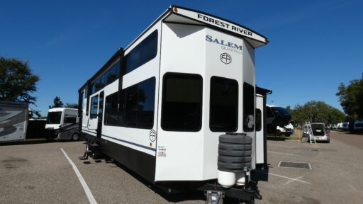 The 2025 Forest River Salem Grand Villa 42VERANDA is a destination trailer designed for extended stays and resort-style comfort, offering a true residential feel both inside and out. Its spacious interior features a large living area with plush seating, an entertainment center with fireplace, and a beautifully appointed kitchen complete with an island, residential appliances, and abundant storage. A private bedroom with a Versa-Tilt custom king bed, generous wardrobe space, and washer/dryer prep makes long-term living comfortable, while the loft area provides additional sleeping or flexible guest space.