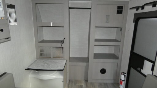 This travel trailer features a little more interior space since you can move between the two twin beds with storage, and there is a portable table you can set up when you want to dine together. You'll find an overhead cabinet in the back for your belongings, along with a storage cabinet up front and a wardrobe. The cassette toilet will add even more convenience. The rear hatch kitchen includes a pull-out griddle and grill combo cooktop, a 3.3 cu. ft. 12V refrigerator, and a microwave oven. There is also a hot and cold faucet and multiple overhead storage cabinets for spices, utensils, and more!
