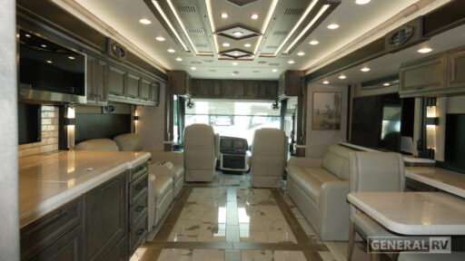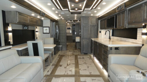 Get ready for luxury trips both near and far in this spacious coach! Once you find somewhere to park for the night, you can cook dinner on the two burner induction cooktop or in the 1.7 cu. ft. Smart convection microwave with an air fryer. There is an Expand-An-Island for more prep space plus pull-out storage and a drawer-type dishwasher to make clean up easier than ever. You can then relax on the DE sofa bed with a lift TV above it or on the theater seats. There is also a dinette with chairs where you can dine together or get some work done while you're away from home. And the half bath off of the kitchen is convenient for everyone. A master bedroom is sure to meet your needs with a power Smart king bed slide with dual nightstands, a 50" TV, and drawers below. The feature you might like most on this coach is the full rear bath! Here, you'll find dual bath sinks with a tri-view mirror, a spacious shower, and a floor-to-ceiling closet, complete with storage cabinets, a safe plus prep for a washer and dryer!