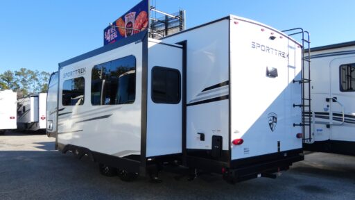 An elegant design and new features come with every one of these Venture RV SportTrek Touring Edition travel trailers! The NXG Huck bolt frame holds these units together and a walkable roof covers them. Heads will turn down the highway and at the campsite with an upgraded graphics package and a painted fiberglass front cap with integrated LED light. The exterior pass-through storage area has slam latch baggage doors with magnetic catches so you don't have to worry about them closing on you and a motion activated light to see your items clearly even at night. Luxury abounds throughout these units, especially with the mandatory Interior Luxury package which comes with solid surface kitchen countertops, designer valances with fabric nightshades, two 30" frameless fireplaces, and Beauflor wood plank flooring that is easy to clean. Come find your favorite model today!